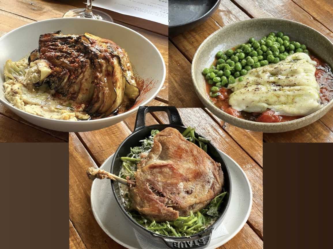 메뉴: 태운 양배추, 꿀넙치, 오리콩피와 들깨 리조또, 와인 하프 2잔